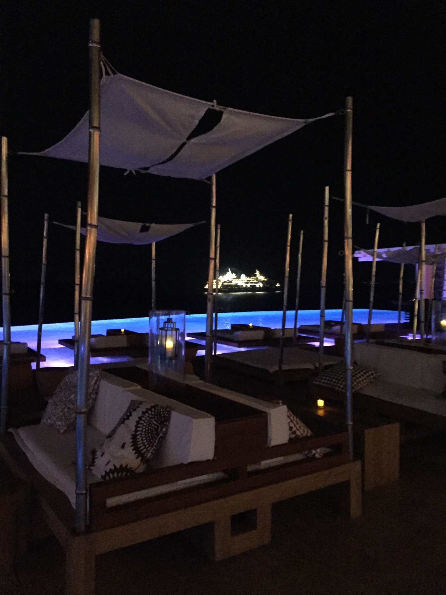 You could walk to town from the hotel, although it was down a busy street so you had to hug the side of the road. If you preferred not to walk, the hotel also ran a shuttle service 24/7. Finally, (and this was VERY important to my husband), they had great cocktails which was definitely an oddity for Greece. Here’s a photo of the sunbeds at night when the pool became more club-like.